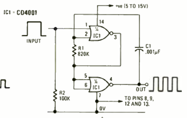 La figura muestra cómo obtener un circuito astable de 800 Hz controlado por una señal externa. El circuito es de una revista Radio Electronics de abril de 1976.