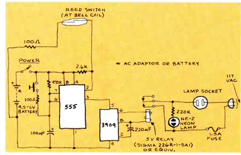 Este circuito, que apareció en la revista Radio Electronics de septiembre de 1982, activa un relé de forma intermitente. El disparo se realiza mediante un interruptor de láminas, pero se pueden utilizar otros tipos de sensores.