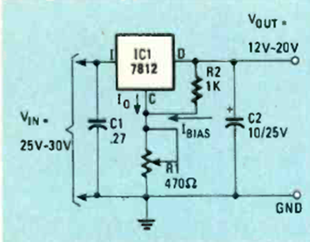 En la figura tenemos un método mejorado para variar la tensión de un regulador 7812. El circuito es de Radio Electronics de julio de 1984. Se puede aplicar a otros reguladores.