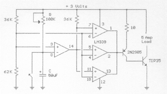 Este circuito con comparador de tensión tiene el retardo que le da el capacitor. El circuito activa un transistor de potencia que debe estar equipado con un buen disipador de calor.