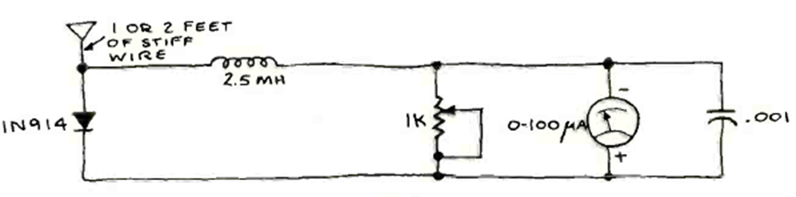 Recomendado para ajuste en transmisores para el rango de 11 metros, este circuito con medidor analógico fue encontrado en la revista Radio Electronics de enero de 1978. El circuito no utiliza fuente de alimentación.
