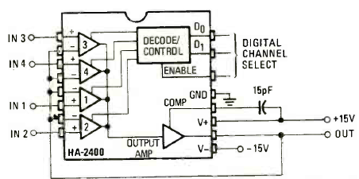 Este circuito con un nuevo amplificador operacional cuádruple se encontró en la revista Radio Electronics de marzo de 1980. El circuito debe estar alimentado por una fuente simétrica de 15 V.