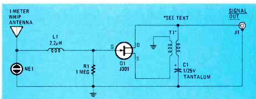 Este circuito, que apareció en la revista Radio Electronics de febrero de 1983, utiliza un FET y tiene buena ganancia en las frecuencias determinadas por los componentes. El FET es cualquier propósito general.