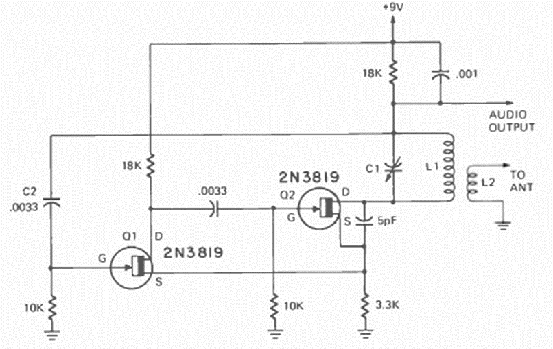Este circuito con una configuración inusual fue encontrado en la revista Radio Electronics de enero de 1974. La frecuencia viene dada por L1/C1 y los transistores aceptan equivalentes.