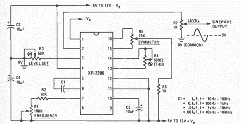 En la figura vemos cómo utilizar el XR2206 para generar señales sinusoidales de una forma diferente. El circuito es de una Radio Electrónica de abril de 1977. Se indica fuente de alimentación.