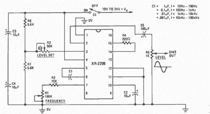 En la figura vemos cómo generar señales sinusoidales de excelente calidad utilizando el XR2206. El circuito es de Radio Electronics de abril de 1977. La tabla al lado del diagrama muestra los valores del capacitor para diferentes rangos de frecuencia.