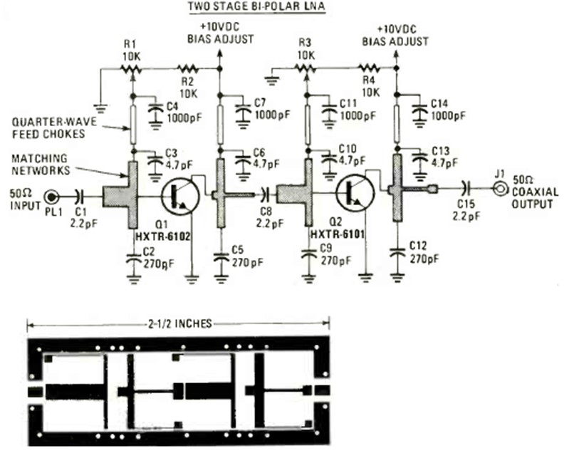 Este circuito, utilizado en la recepción de televisión por satélite de la década de 1980, se encontró en la revista Radio Electronics de marzo de 1980. Observe el diseño de la placa.