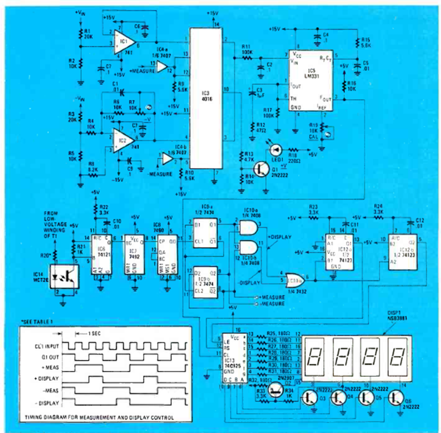 Encontramos este circuito en la revista Radio Electronics de febrero de 1983. El circuito de 4 dígitos se basa en integrados dedicados de la época. La fuente de alimentación no se muestra.