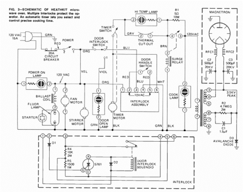 Este es el circuito típico de un viejo horno microondas. Lo sacamos de una revista de Radio Electrónica de agosto de 1973, de un artículo que enseñaba a hacer reparaciones.