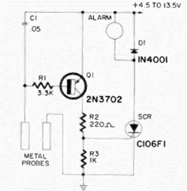 Este sencillo circuito que activa un timbre fue encontrado en la revista Radio Electronics de julio de 1971. La fuente debe estar aislada y los sensores son barras metálicas.