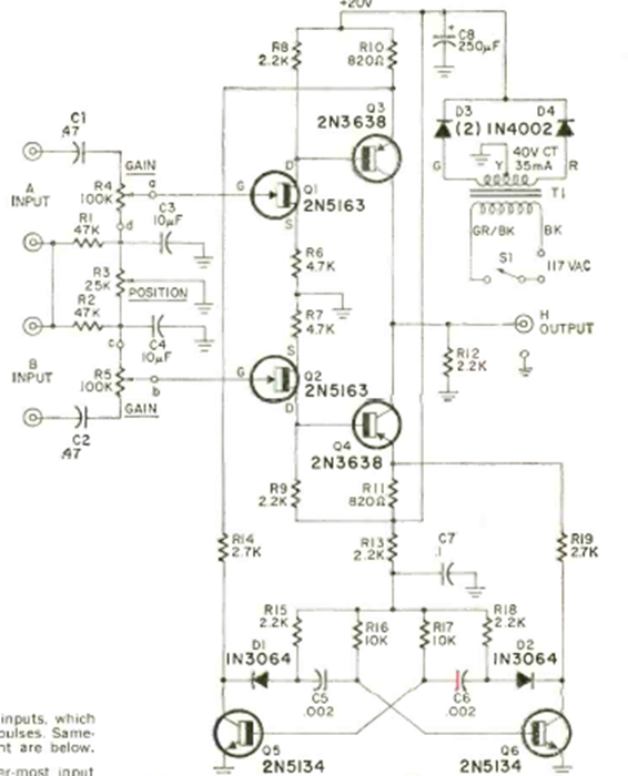 Este interruptor electrónico publicado en la revista Radio Electronics en julio de 1970 permite observar dos señales en un simple osciloscopio. El circuito es para señales de hasta 300 kHz. Los transistores son tipos de la época.