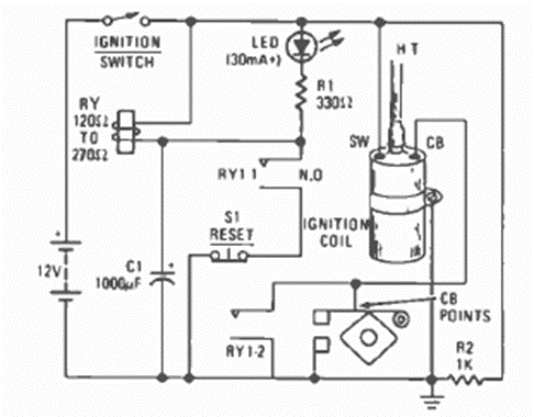 Este circuito inmoviliza un coche con un antiguo sistema de encendido con interruptor mecánico. Fue encontrado en la revista Radio Electronics de noviembre de 1976. El circuito utiliza un relé para cortocircuitar los contactos.