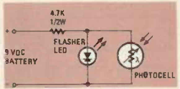 En la figura tenemos una forma de controlar el parpadeo de un LED intermitente de 5 V con un LDR. El LED parpadea sólo cuando la luz está apagada. El circuito es de una Radio Electronics de octubre de 1980.