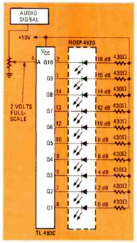 Este es uno de los muchos circuitos posibles para el LM3914 como indicador de audio. El potenciómetro de ajuste tiene valores típicos entre 10k y 100k dependiendo de la intensidad de la señal de audio. El circuito es de una Radio Electronics de febrero de 1981.