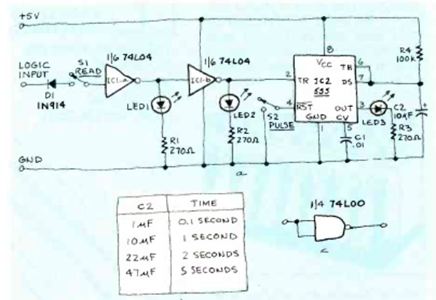 Este sencillo circuito de prueba lógica con 3 LEDs fue encontrado en la revista Radio Electronics de octubre de 1985. La alimentación es según la lógica y esta versión está indicada para TTL.