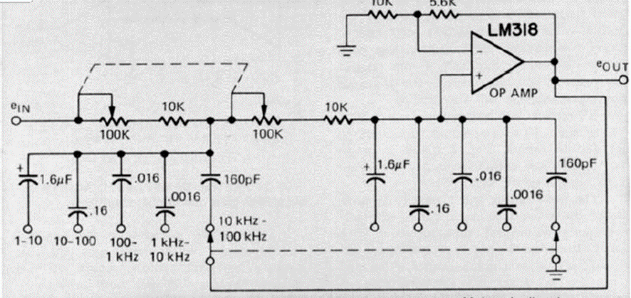 Usando el 741 este circuito se puede ajustar a valores entre 1 eHz y 100 kHz. La fuente de alimentación debe ser simétrica. Lo encontramos en la revista Radio Electronics de noviembre de 1973.
