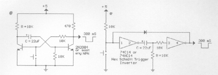 Encontramos este circuito en documentación de los años 90. Es una configuración común que viene en dos versiones, usando transistores y usando dos inversores integrados.