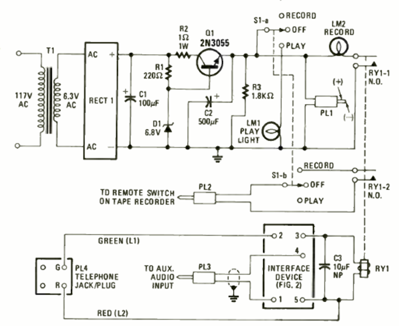 Este circuito para grabación telefónica fue encontrado en la revista Radio Electronics de junio de 1979. Los componentes son comunes en la época y la alimentación se suministra a través de la red eléctrica.
