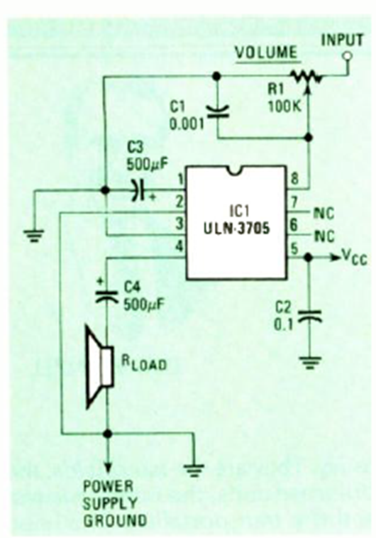 Usando el ULN-3784B, este circuito generalmente proporciona 5W a 24W. Sin embargo, puede funcionar desde 9V. El circuito es de Radio Electronics de octubre de 1984.