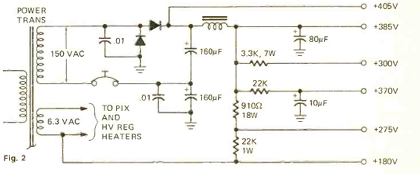 Esta fuente de alimentación apareció en la revista Radio Electronics en diciembre de 1973. Este tipo de circuito se utilizaba en aquella época para alimentar televisores de válvulas.
