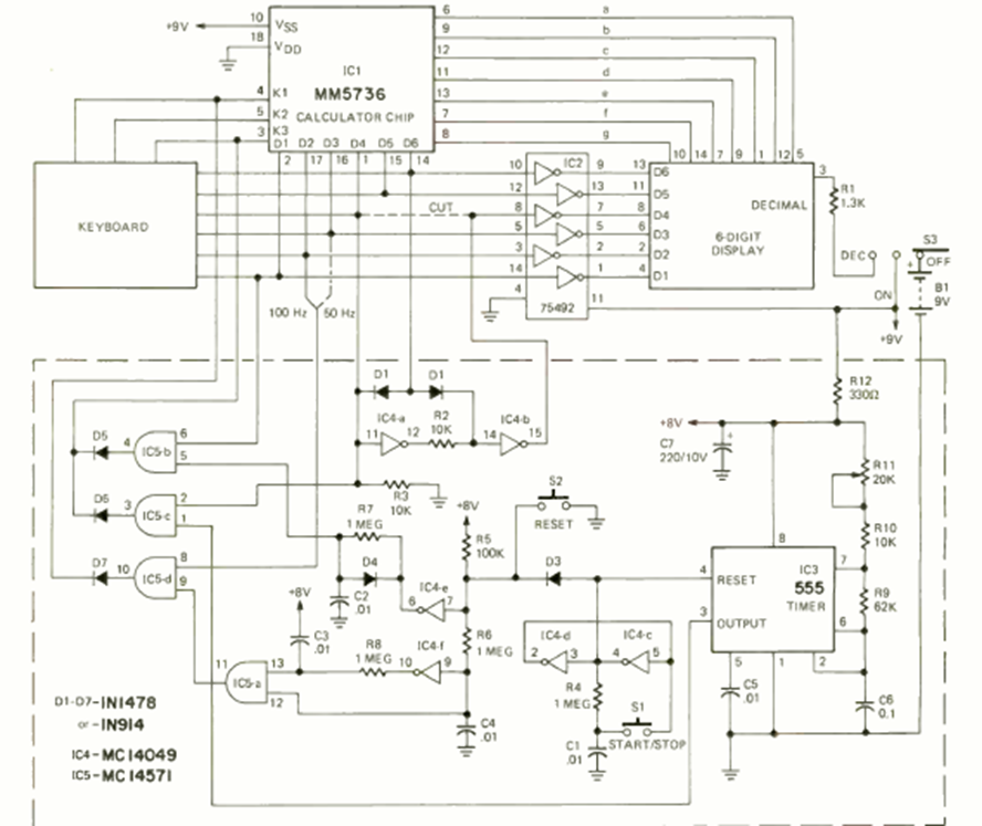 Este circuito fue encontrado en la revista Radio Electronics de febrero de 1976. Los componentes son de la época basados en el 555. La alimentación debe realizarse con las tensiones indicadas.