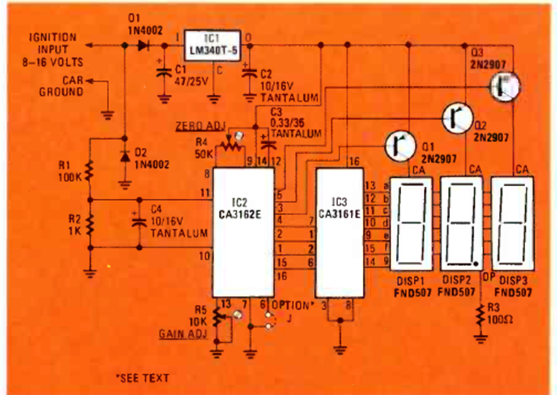 Recomendado para aplicaciones automotrices, este circuito se publicó en la revista Radio Electronics en julio de 1983. El circuito se puede adaptar para otros fines. Hoy en día es difícil encontrar integrados dedicados.