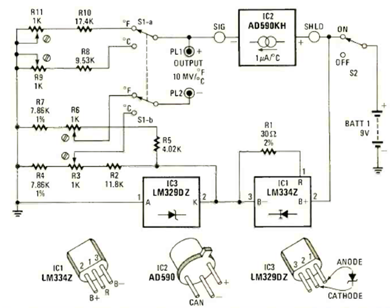 Este circuito se encontró en la revista Radio Electronics de julio de 1978. El circuito utiliza el voltímetro digital común como indicador. Los sensores son circuitos integrados de la época.