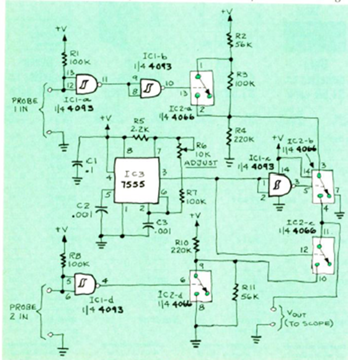 Para señales de baja frecuencia, este circuito transforma un osciloscopio simple en un trazo doble. El circuito es de la revista Radio Electronics de octubre de 1984.