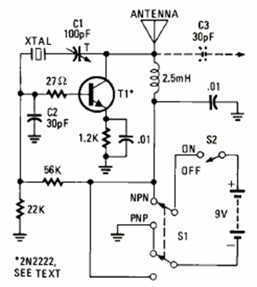 Este circuito que puede funcionar como un pequeño transmisor fue encontrado en la revista Radio Electronics de julio de 1978. La frecuencia depende del cristal y alcanza unas pocas decenas de megahertz.