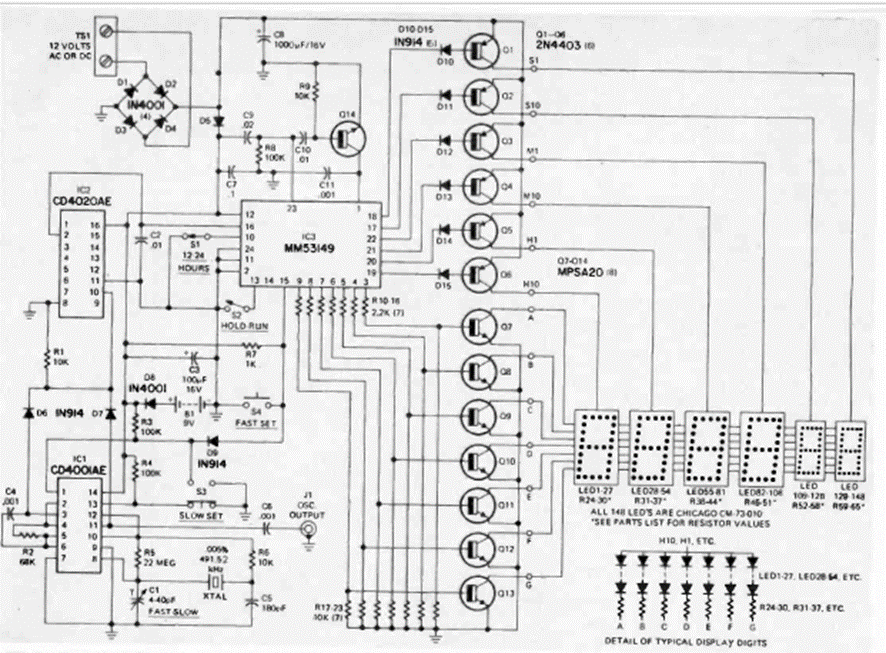 Este es el circuito de un reloj digital publicado en la revista Radio Electronics en enero de 1975. El reloj utiliza un módulo de período y muestra horas, minutos y segundos. Válido para restauración.