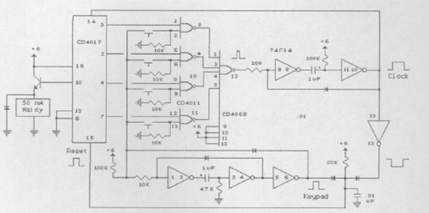 Este circuito lo encontramos en documentación de los años 90. El circuito tiene 4 teclas y se alimenta mediante tensión según el relé. El circuito utiliza lógica CMOS y se puede cambiar a más interruptores.