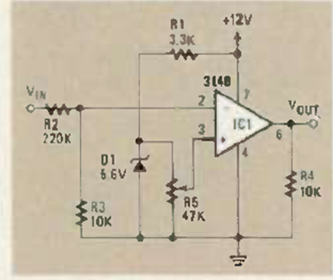 En la figura tenemos la forma de utilizar un operacional como divisor de tensión. El circuito es de una revista de Radio Electronics de junio de 1986. La tensión de referencia viene dada por un diodo zener.