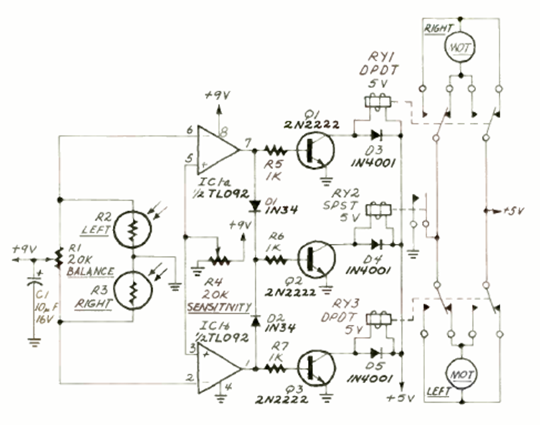 Este interesante circuito sirve para controlar un pequeño robot que busca una fuente de luz. Los sensores son LDR y el circuito tiene un ajuste de equilibrio de sensibilidad. El robot utiliza dos motores y tres relés.