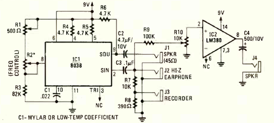 La frecuencia de cada nota depende de R2 el cual debe ser reemplazado por un teclado. El circuito es de una Radio Electronics de abril de 1980. La fuente de alimentación es de 9 V para el amplificador utilizado.
