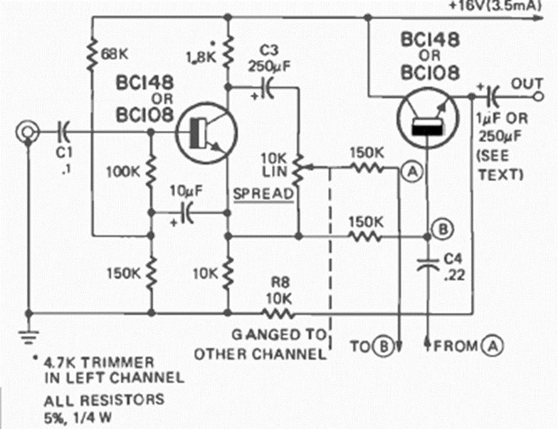 Este circuito controla la separación de los canales como se describe en el artículo de la revista Radio Electronis de marzo de 1973. El circuito fue propuesto por Mullard (Philips) y consta de dos canales como se muestra.