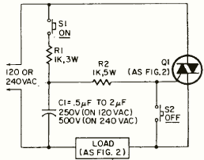 Este circuito de control de potencia biestable convencional mediante triac fue encontrado en la revista Radio Electronics de junio de 1970. El triac es según la carga. El circuito se puede cambiar para que funcione a 220 V.