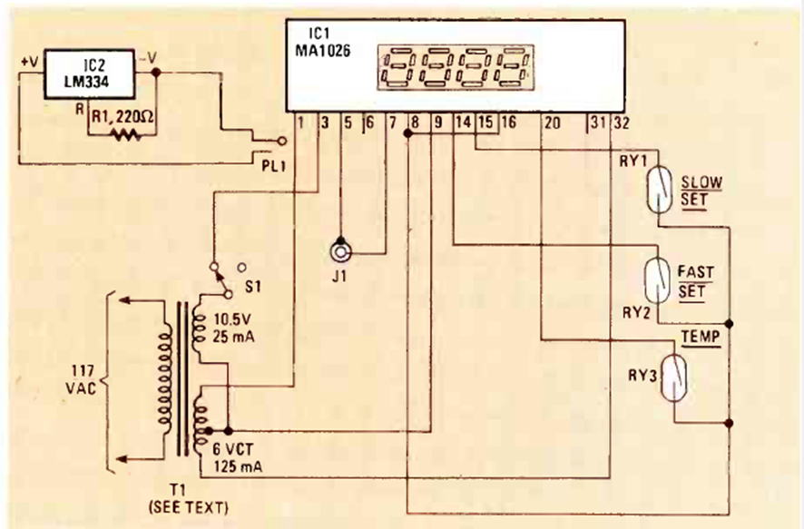 Este circuito de termómetro digital con módulo MA1026 se encontró en la revista Radio Electronics de febrero de 1981. Tenga en cuenta los voltajes especiales del transformador.