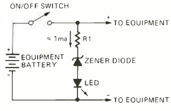 Este circuito no sólo indica cuando la batería está encendida sino también cuando está baja. El circuito es de una Radio Electronics de julio de 1974. El zener es según la tensión de la batería.