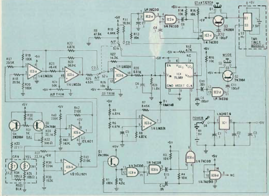 Este circuito fue encontrado en la revista Radio Electronics de mayo de 1984. Analiza los gases que emite el escape de un coche. El circuito utiliza un sensor de gas especial de la época.