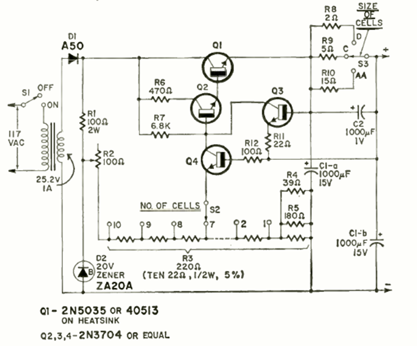 Este circuito de cargador de batería se encontró en la revista Radio Electronics de agosto de 1970. El circuito utiliza 4 transistores. Q1 debe estar equipado con un buen disipador de calor.