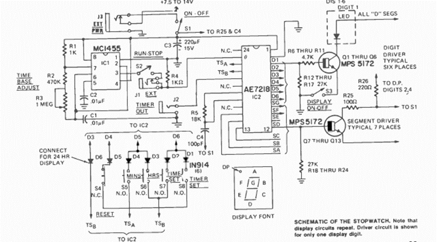 Se trata de un circuito de reloj integrado de la época que se publicó en la revista Radio Electronics del mes de noviembre de 173. El circuito utiliza un AE7218 que sirve de base para los restauradores.