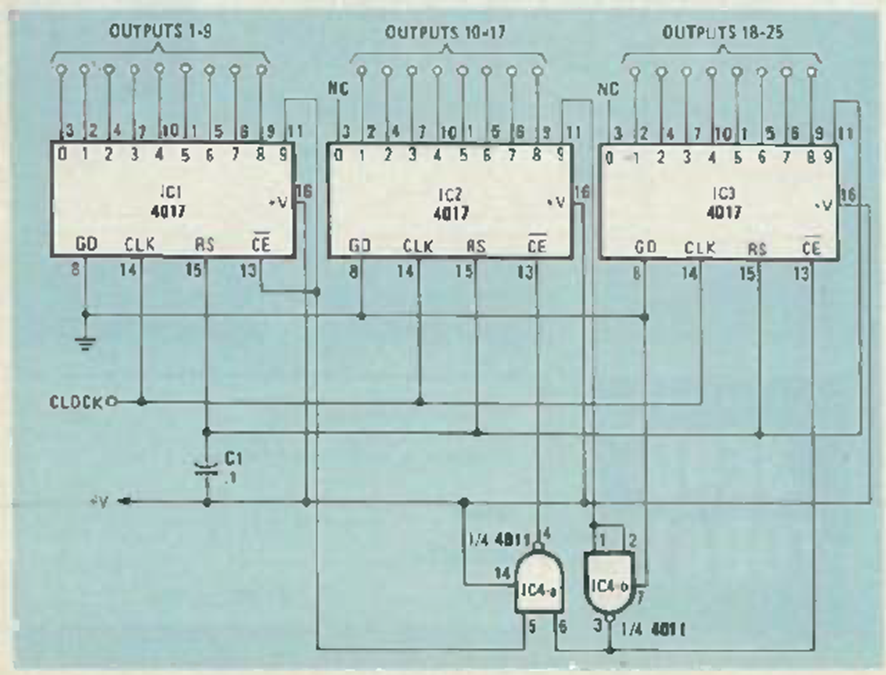 Este circuito es de la revista Radio Electronics de mayo de 1984. Con él se puede aumentar el número de salidas del 4017. El circuito tiene 25 salidas. La fuente de alimentación depende de la aplicación, oscilando entre 3 y 15 V.