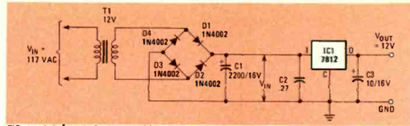 Esta es una de las muchas versiones que tenemos de un suministro de 12 V con el 7812. La encontramos en la revista Radio Electronics de julio de 1984. El circuito integrado debe montarse en un disipador de calor.