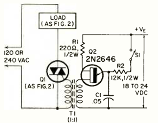 Este circuito de control triac con transformador y transistor unijunción se encontró en la revista Radio Electronics de junio de 1970. El transformador tiene una relación de vueltas de 1 a 1.