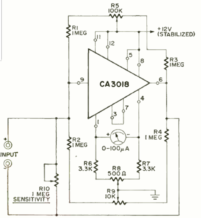 Utilizando un circuito integrado RCA, este amplificador de instrumentación se encontró en una revista de Radio Electronics de noviembre de 1970. El instrumento tiene una escala completa de 100 uA.