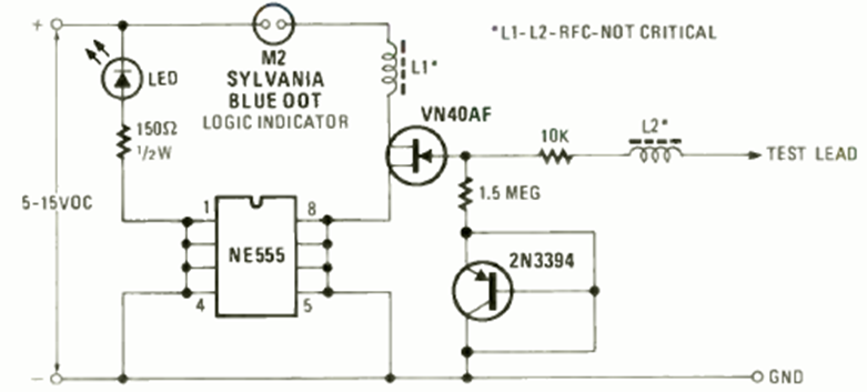 Este indicador o prueba lógica se encontró en la revista Radio Electronics de abril de 1979. El circuito integrado es el 555 y el FET puede ser de cualquier tipo de propósito general.