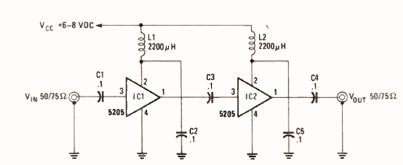 Utilizando el circuito integrado NE5205, este circuito fue encontrado en la revista Radio Electronics de mayo de 1987. Puede amplificar señales de hasta 450 MHz.