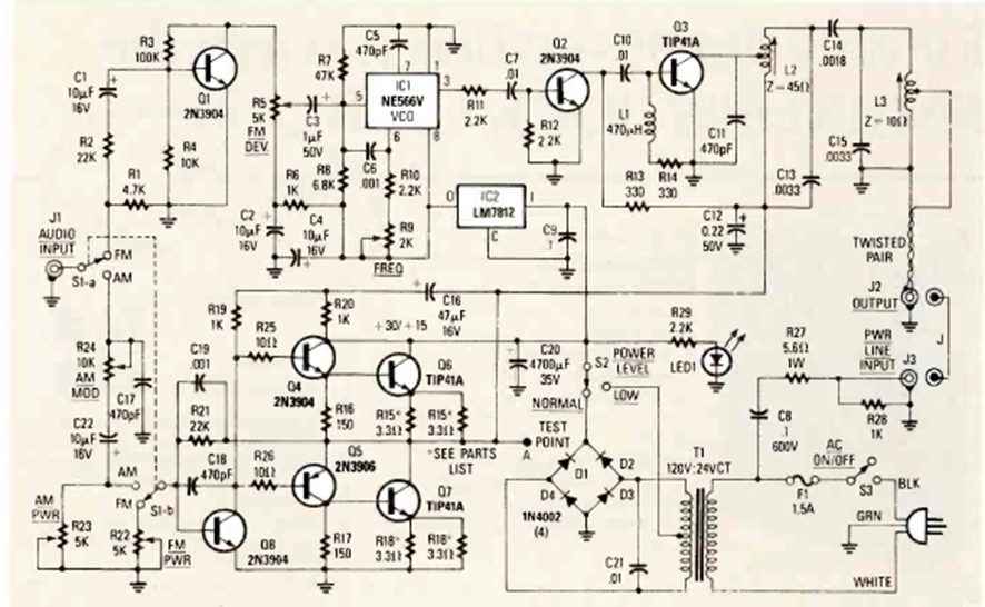 Este circuito se encontró en la edición de enero de 1989 de la revista Radio Electronics. El circuito envía señales de audio modulando una portadora de baja frecuencia a través de la red eléctrica.
