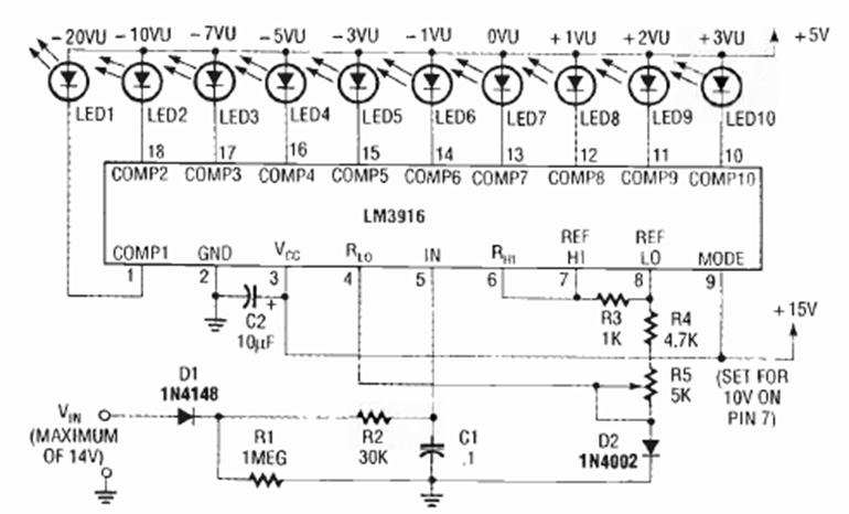 Encontrado en la revista Radio Electronics de marzo de 1992, este circuito tiene dos voltajes de alimentación. La tensión de entrada máxima es 14 V.