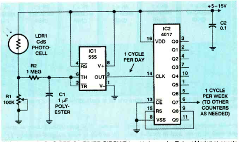 Este circuito utiliza el amanecer y el atardecer como señal de sincronización. El circuito es de una revista Electronics Now de mayo de 1999. El ciclo es de un pulso por semana.